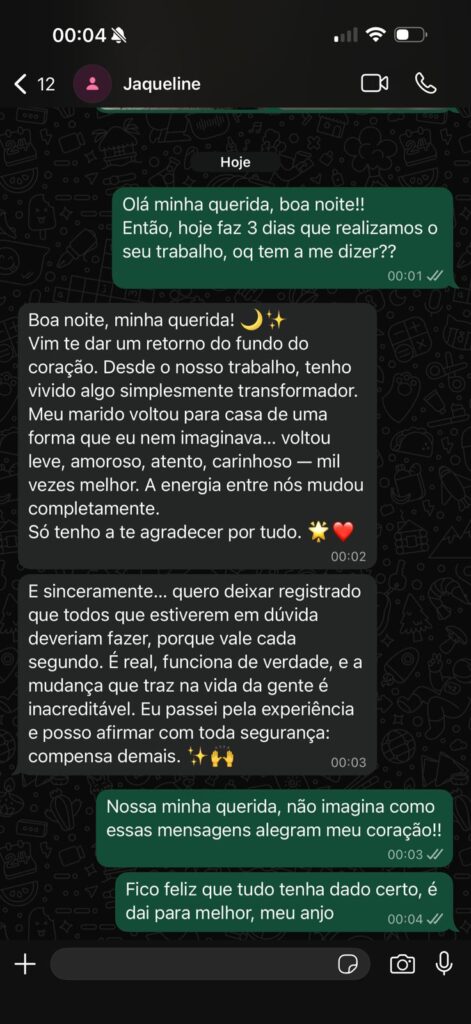 Sou a Karla e só tenho a agradecer à Catarina. Depois do trabalho amoroso, meu marido voltou pra casa em poucos dias. A energia mudou completamente e hoje estamos bem novamente. Gratidão!